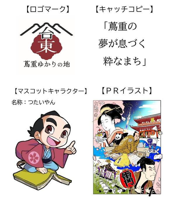 「蔦屋重三郎ゆかりの地 台東区」ロゴマーク・キャッチコピー・マスコットキャラクター・PRイラストをご使用いただけます