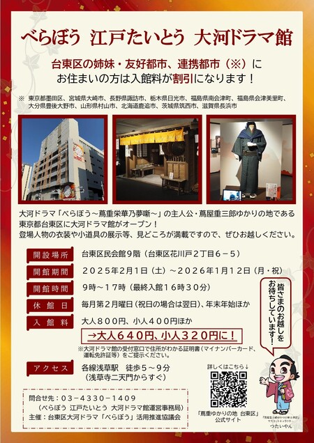 台東区の姉妹・友好都市、連携都市にお住まいの方は「べらぼう 江戸たいとう 大河ドラマ館」の入館料が割引になります!