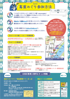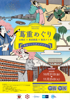 大河ドラマ「べらぼう~蔦重栄華乃夢噺~」の主人公・蔦屋重三郎ゆかりの地の台東区で、『蔦重めぐり ~台東区×東武鉄道×東京メトロ~ 手ぬぐいスタンプラリー』を開催します。「べらぼう 江戸たいとう 大河ドラマ館」をスタートし、蔦屋重三郎ゆかりの地などを巡りながら、各所に設置されたスタンプを手ぬぐいに押し、オリジナルの手ぬぐいを完成させていくイベントです。ぜひご参加ください。