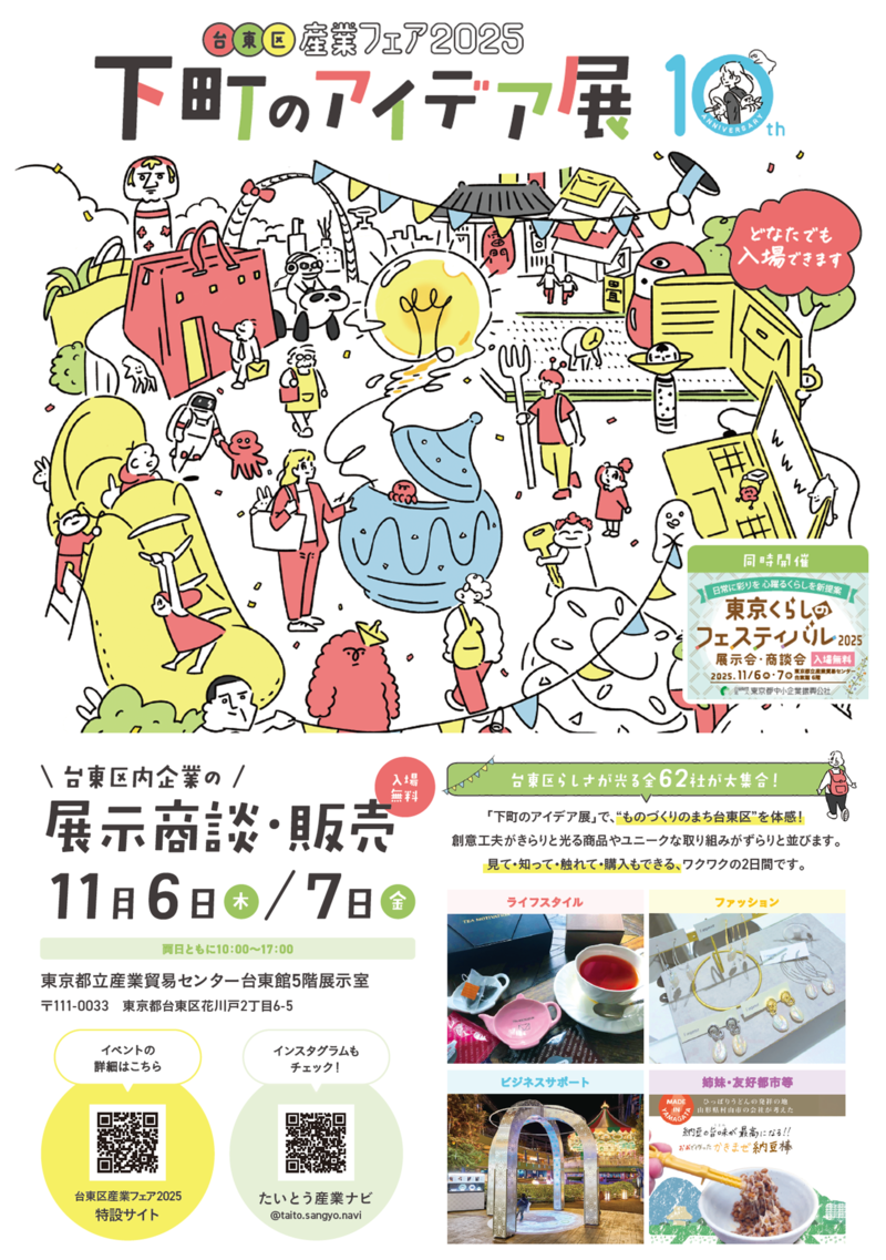 台東区の事業者がみんなでつくる見本市「台東区産業フェア2025 ~下町のアイデア展~」を11月6日、7日の2日間開催します。下町ならではのつながりから生まれるアイデアやワクワクを皆さんにお届けします!