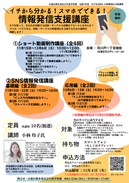 ※講座内容に関するお問い合わせは、台東区生涯学習課(TEL:03-5246-5811)までお問い合わせください。