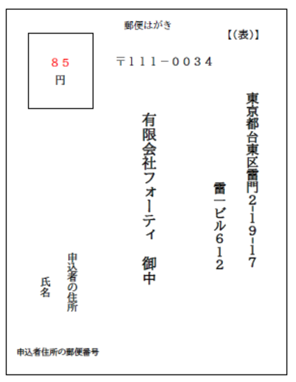 通常はがき(1コース1通)に、下記の必要事項をご記入のうえ、有限会社フォーティ(台東区雷門2丁目19番17号 雷一ビル612)へお送りください。