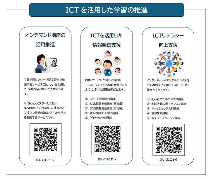 ICTを活用し、多様な学習講座を区民がいつでも受講できる環境を整備します。また、社会教育団体等で活動している区民の方が、自ら情報発信を行うことができるスキルの習得やインターネット・デジタルデバイス等に関する知識が十分でない区民の方に対してICTリテラシ―向上を目的とした講座を実施します。