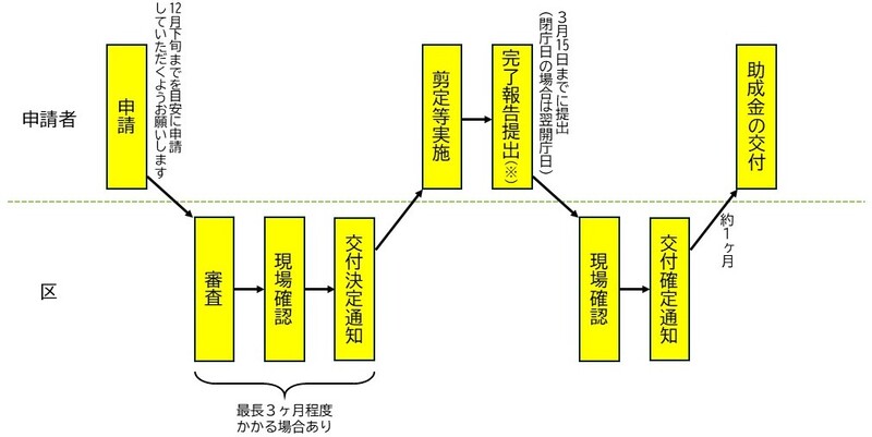 - 申請状況等により、審査や区職員による現場確認及び交付決定通知まで3ヶ月程度かかる場合があります。そのため、剪定等の実施予定日から逆算し、余裕をもって申請してください。