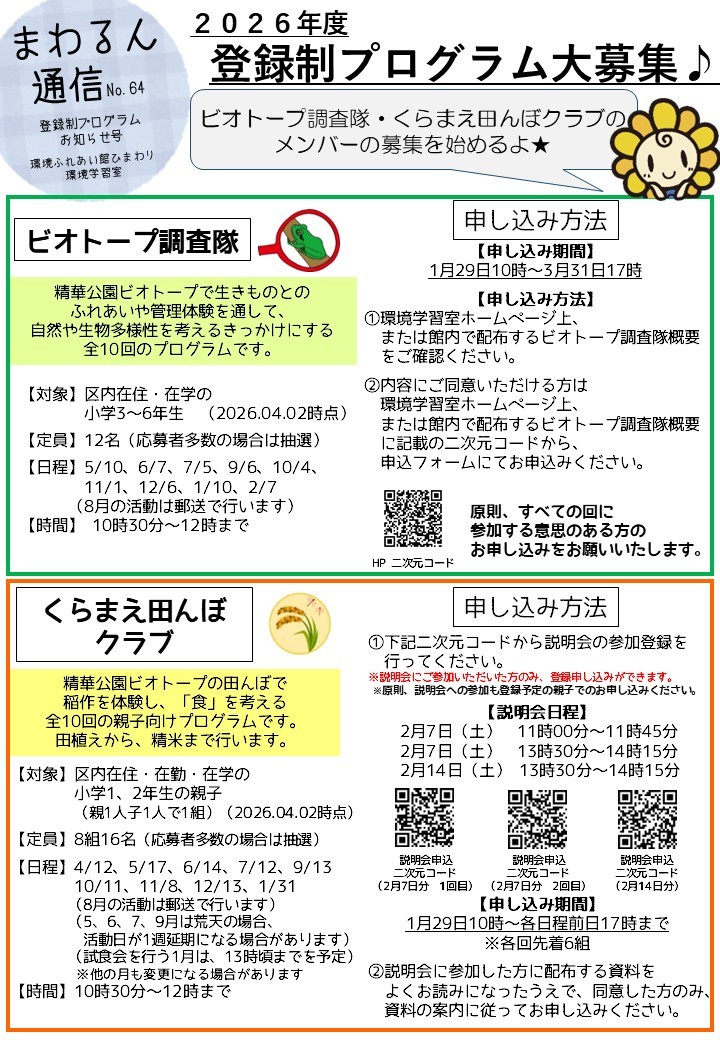 まわるん通信では、環境学習室のイベントやプログラム、その季節の見所、活動報告などを紹介しています。(館内でも配布しています)