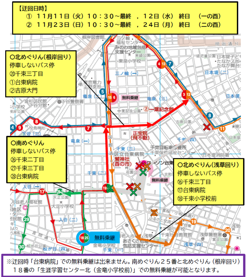 北めぐりん(浅草回り・根岸回り)・南めぐりんにおいては、酉の市の開催に伴い一部交通規制があるため、迂回運行を実施します。