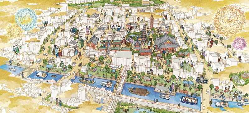 浅草地区のまちづくりは、平成19年6月に策定した「浅草地域まちづくり総合ビジョン」以降、東京スカイツリーの開業や、外国人観光客を含む来街者の増加など、環境が大きく変化しています。このため、概ね20年後の浅草の将来像と、その実現に向けた取組の方向性を示す「浅草未来図案~まちづくりビジョン~」を策定し、未来のまちの姿の実現に向けて、まちづくりを推進していきます。