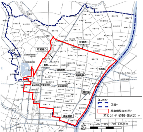 本計画の対象地区は、下図の赤枠に示す台東区における駐車場整備地区全体とします。詳しくは下図を参照ください。