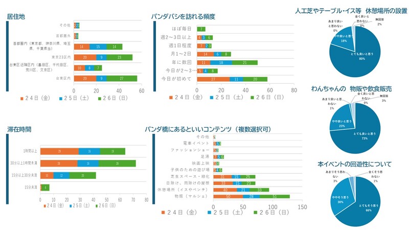 来場者の居住地は区内が30%・区外が70%で、パンダ橋への訪問頻度は週1~毎日が17%、初めて~数回程度が41%でした。滞在時間は30分以上滞在された方が73%で、うち35%は1時間以上滞在されていました。また、本社会実験が回遊性向上に寄与しいていると思った方は96%でした。本社会実験に肯定的な意見の方は98%で、休憩場所の設置や各種取り組みについて好意的な回答を得ることができました。