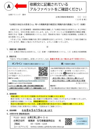 「台東区の身近なお医者さん」等への掲載希望の確認及び掲載内容の調査について