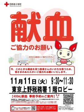 台東区では、台東区役所正面玄関前、生涯学習センター駐輪場 及び 台東保健所で東京都赤十字血液センターによる献血活動を実施しています。