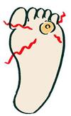 動脈硬化により足の血管が細くなり、足先まで血液が十分に流れづらくなることに加え、上記のとおり糖尿病神経障害により足の感覚が鈍くなります。このような足に、外傷、靴擦れ、ウオノメ、低温やけどなどの傷が出来ると、潰瘍や壊疽へと悪化することがあります。足の小さな変化に早く気づき、こまめに手入れをすることが大切です。