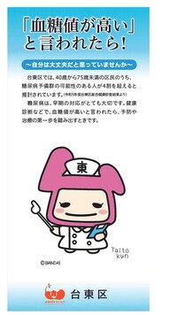 台東区のオリジナルリーフレット『「血糖値が高い」と言われたら!』を作成し、保健所の窓口等で配布をしています。糖尿病に関する基礎知識や予防方法、区のサービス等を紹介しています。ご希望の方は、下記担当までお気軽にお問合せください。