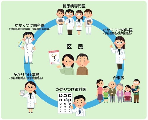 台東区では、区民の糖尿病予防・重症化予防のために、地域関係団体と「糖尿病対策地域連携委員会」を設置し、糖尿病に係る地域連携を推進することで糖尿病対策を効果的に推進していきます。
