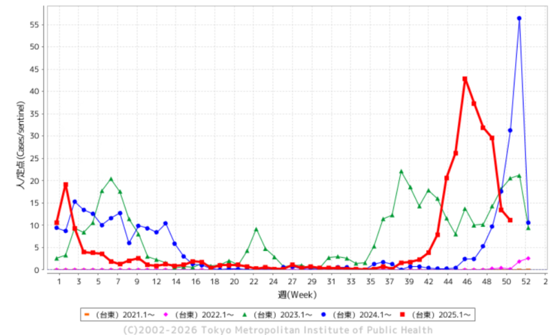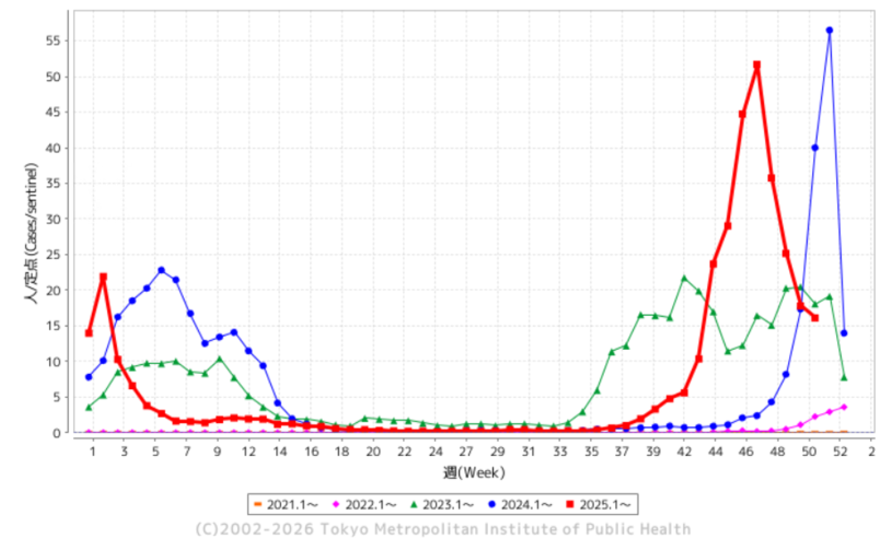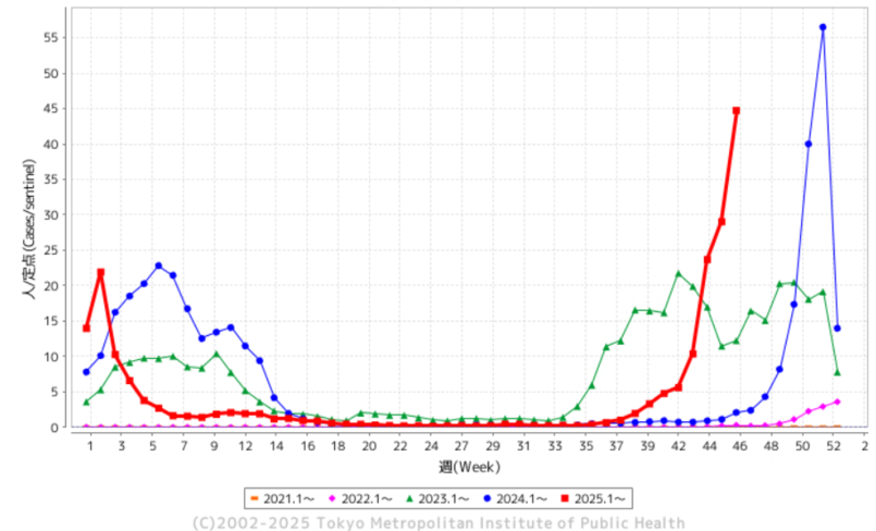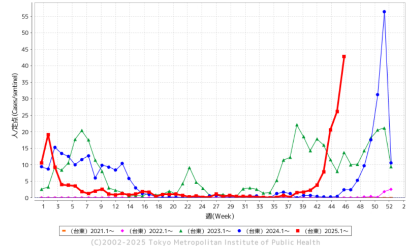 都内のインフルエンザ定点医療機関からの11月3日から11月9日(第45週)の患者報告数が警報基準を超えました。昨年よりも6週早く警報基準を上回り、都内ではインフルエンザの流行が拡大しています。