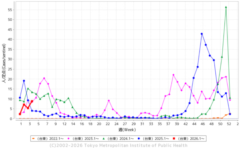 直近では10月20日から10月26日(第43週)において患者報告数が都の注意報基準を超え、11月3日から11月9日(第45週)には警報基準を超えました。その後、一旦は注意報基準を下回ったものの、再度注意報基準を超えました。警報解除後に再度注意報基準を超えたのは、2008-2009年シーズン以来、17年ぶりとなります。