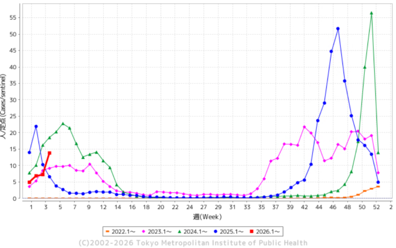 都内のインフルエンザ定点医療機関からの1月19日から1月25日(第4週)の患者報告数が13.83人となり、都の注意報基準を再度超えました。