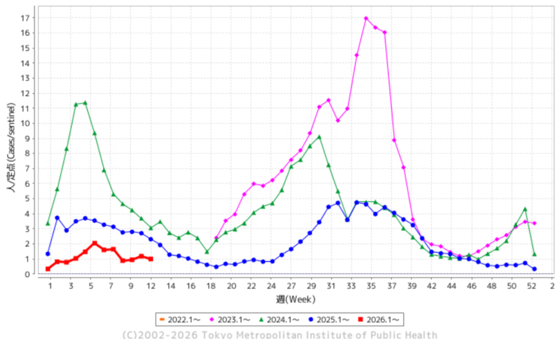 全国的に患者報告数が増加しています。直近で過去4年間を大きく上回っており、引き続き注意が必要です。