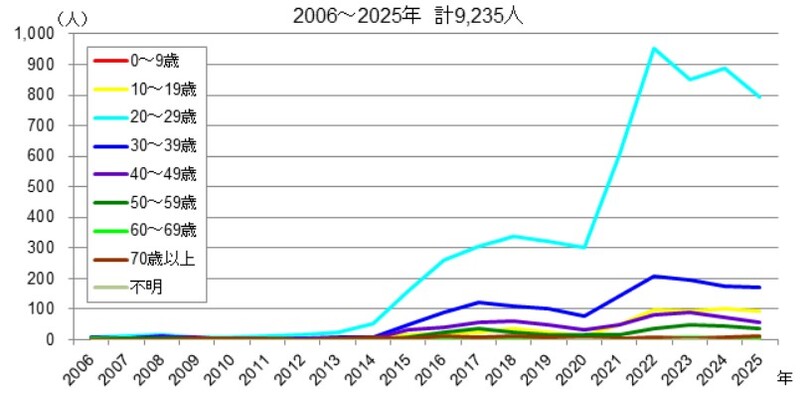 近年、特に、女性の報告数が増加しており、年代別でみると20歳代が多くの割合を占めています。