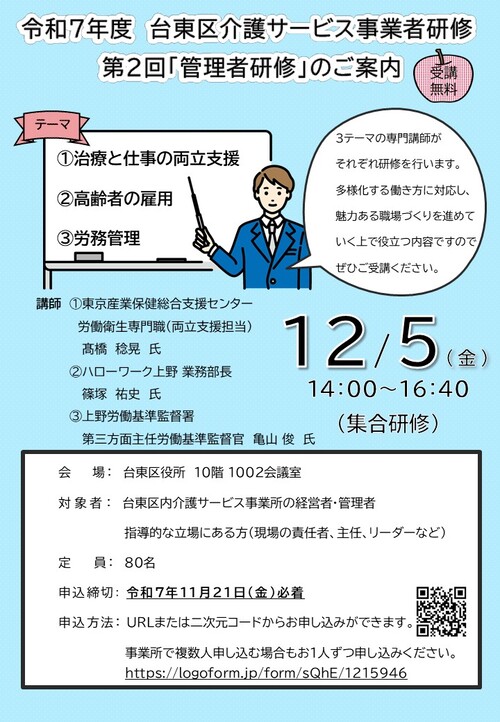 区内の介護サービス事業所の管理者や経営者等を対象に、労務管理・リスクマネジメント・人材育成等、介護サービス事業所の運営の基盤強化を目的とした管理者研修を実施いたします。お一人でも多くの方のご出席をいただきますようお願いいたします。
