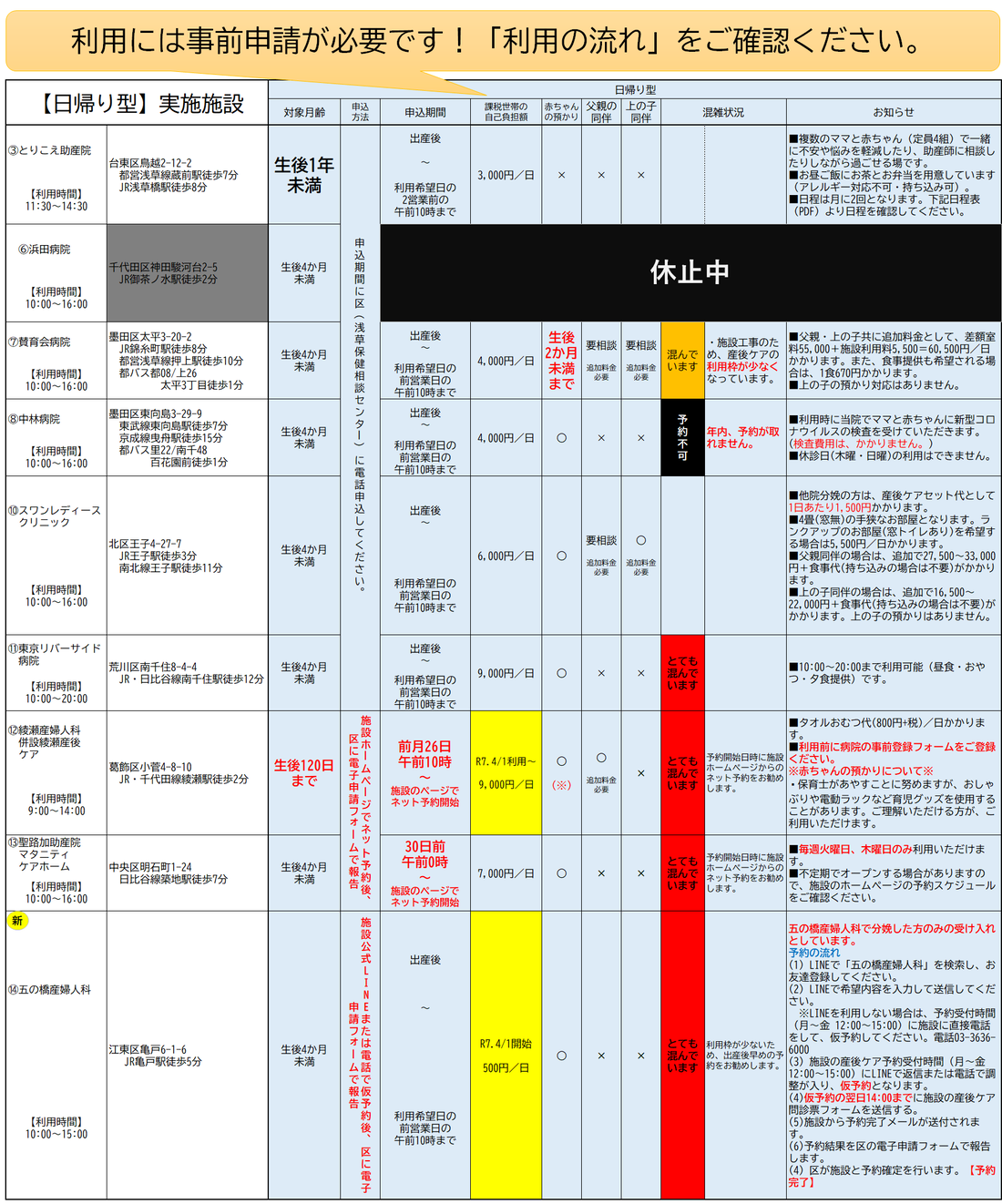 ・聖路加助産院マタニティケアホーム宿泊型の利用申込方法が5月12日利用分から施設のホームページからの申請に変わります。予約後、区に電話連絡をお願いします。一覧表をご確認ください。