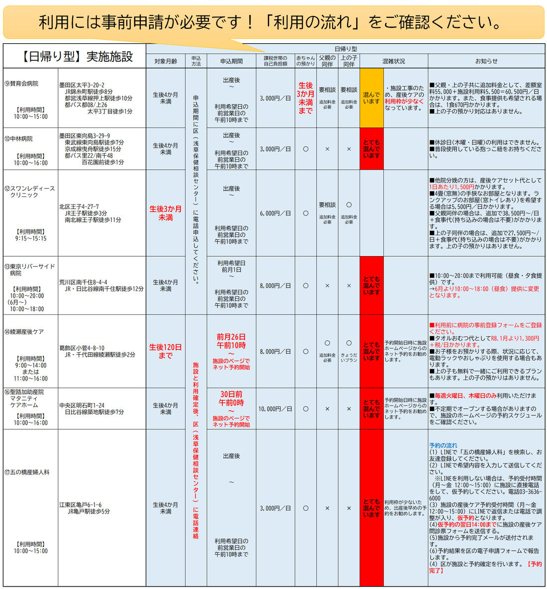・聖路加助産院マタニティケアホーム宿泊型の利用申込は施設のホームページからの申請となります。予約後、区に電話連絡をお願いします。一覧表をご確認ください。