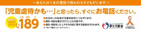 | 児童相談所虐待対応ダイヤル | 通年 | 24時間 | 189(いち早く) |