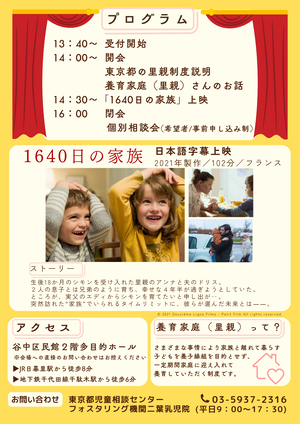 内容:東京都の里親制度説明・養育家庭(里親)さんのお話・『1640日の家族』の上映