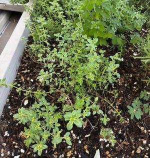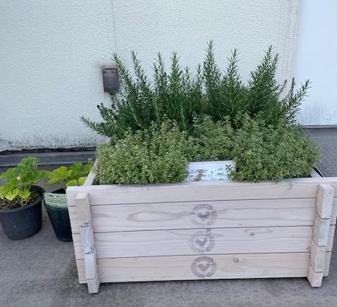 6株のハーブたちは、花壇に植えて1か月で、両手サイズくらいに成長しました。