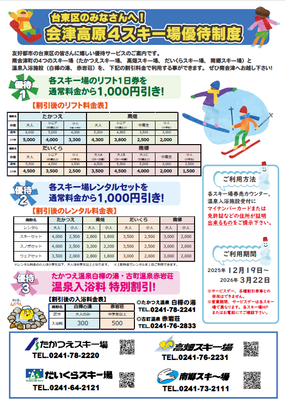 友好都市福島県南会津町から、台東区在住の方へ会津高原4スキー場優待制度のお知らせです。