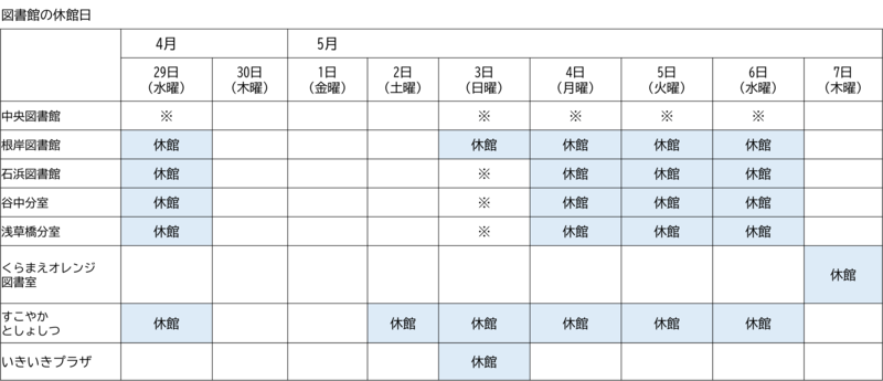 | 石浜図書館 | 4/20~4/23 | 4/26~4/30 | 5/8 |